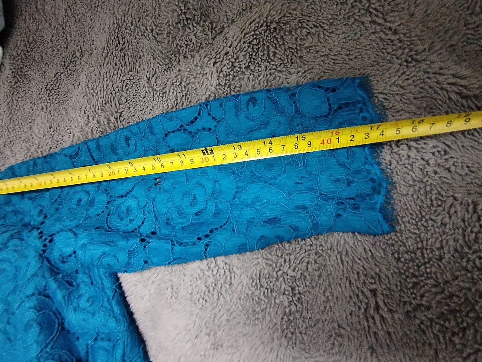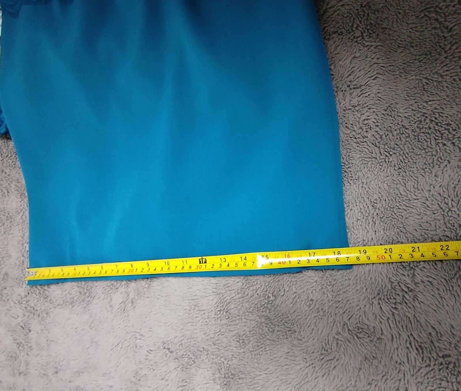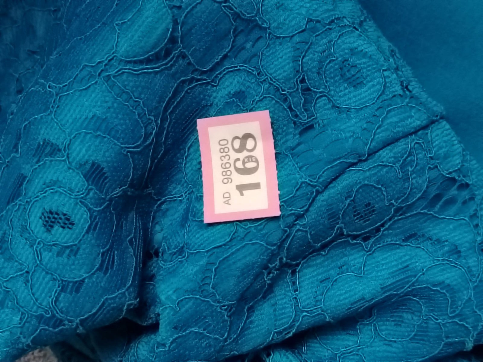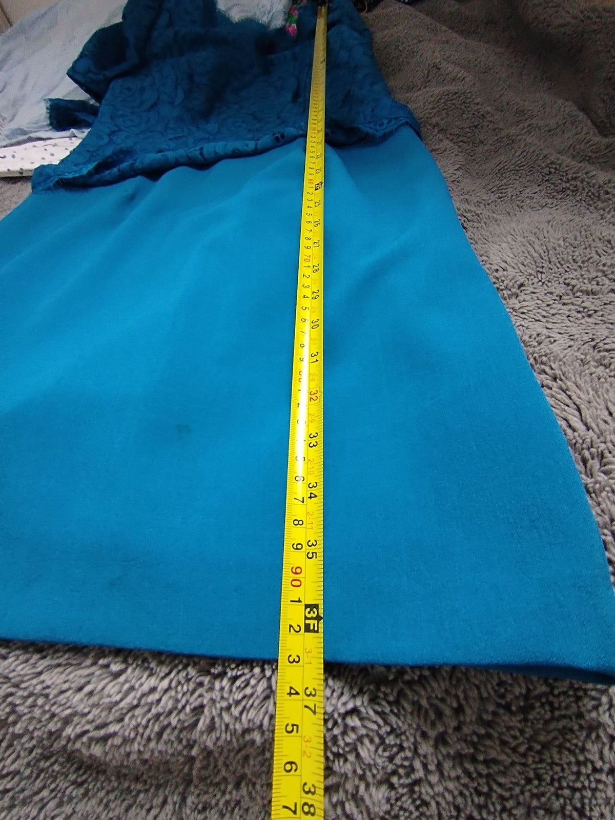 Features: Teal lace overlay bodice with scalloped hem, V neckline, 3/4 sleeves, concealed front zip, fully lined sheath silhouette