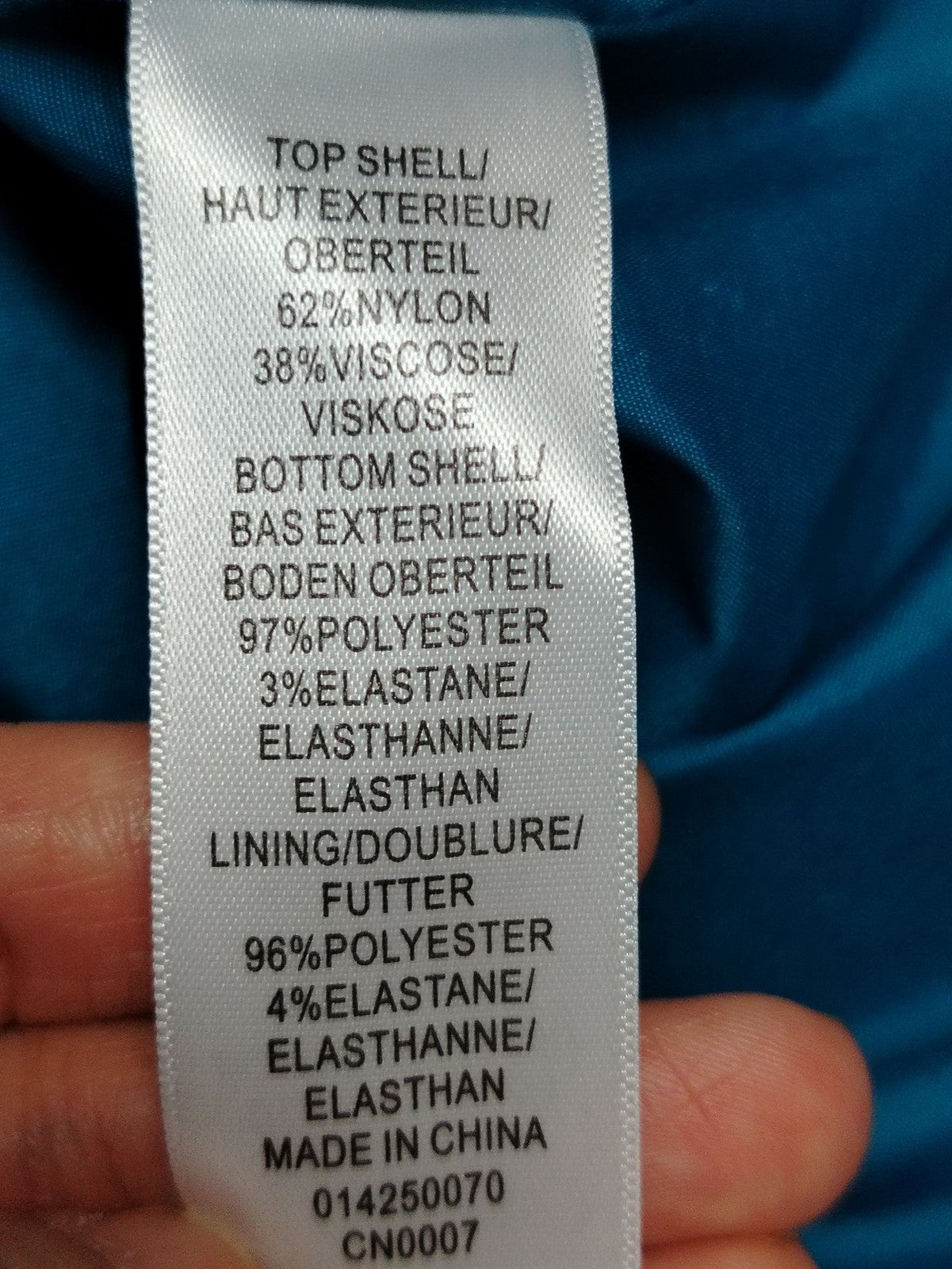 Material: Top shell 62% Nylon 38% Viscose; Bottom shell 97% Polyester 3% Elastane; Lining 96% Polyester 4% Elastane