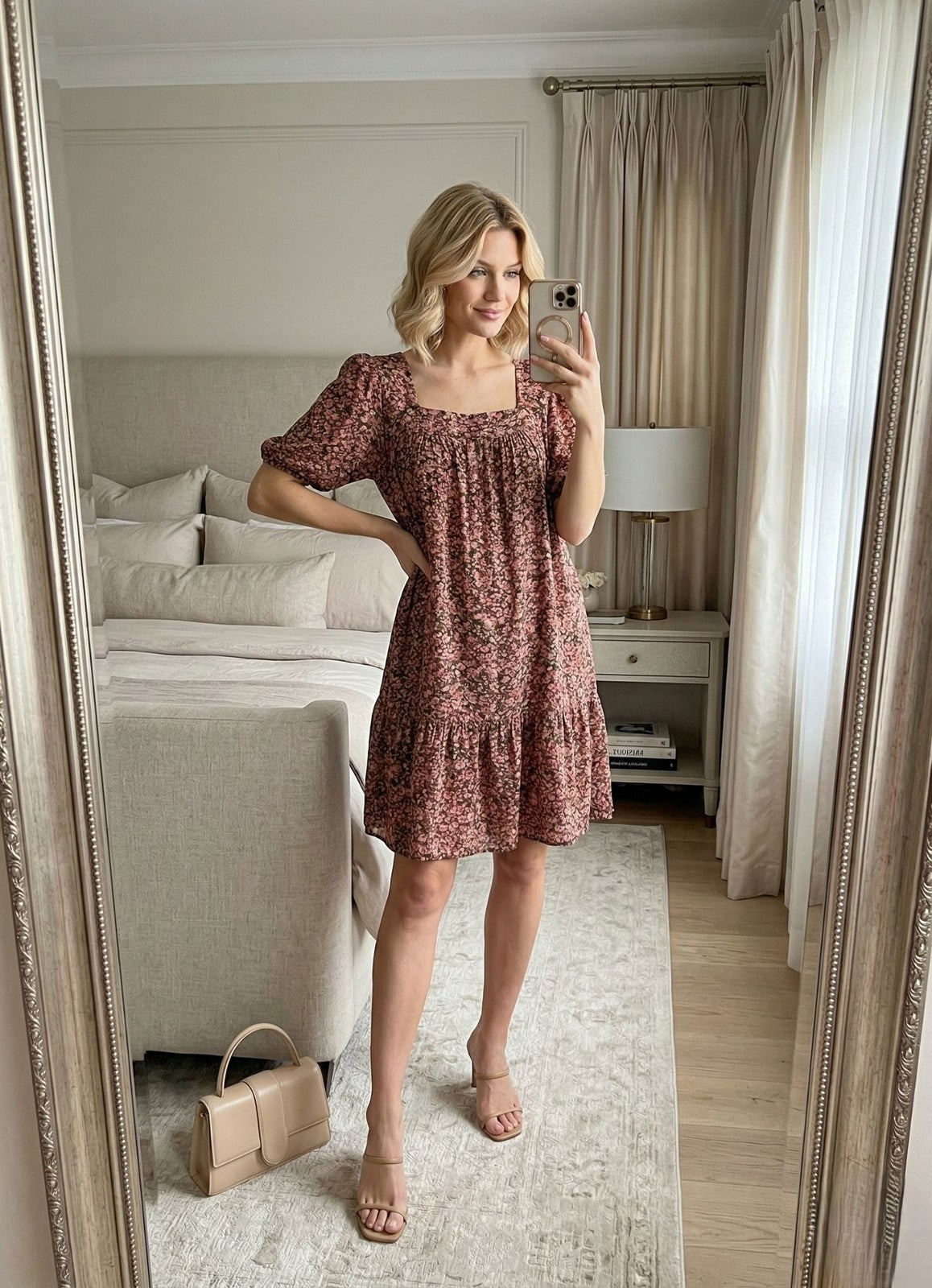 Features: Square neckline, smocked bodice, short puff sleeves, tiered skirt with ruffle hem and elastic detail