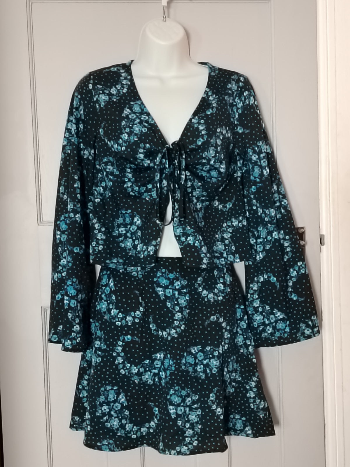 Wednesday's Girl Floral Co-ord Set Size S - Tie Front Bell Sleeve Top & Mini Ski