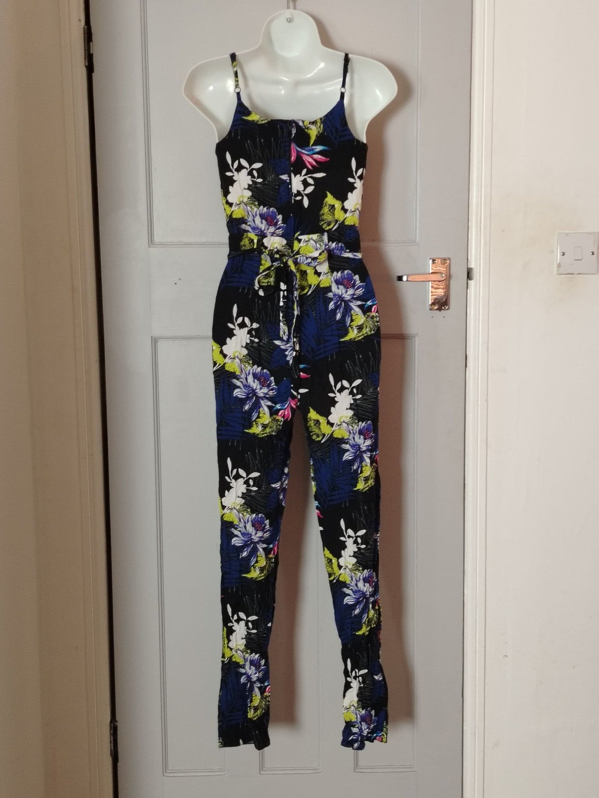 Womens Jumpsuit Spaghetti Strap Belted Floral Print Navy Black Summer Pockets
